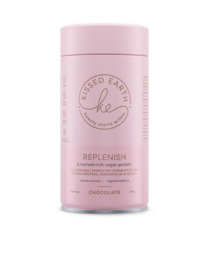 Kissed Earth Replenish – our nutrient dense and highly sought after vegan protein blend that will elevate your vitality. Made with a nourishing organic fermented pea protein and Australian faba bean protein base with added probiotics, amino acids, organic fibre and mineral salts. Replenish is so much more than just a protein powder – it’s a versatile wellness supplement that can be used to replenish, repair and support your body from within.