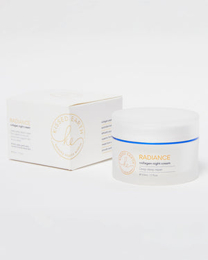 Deliver a nightly boost of hydration to your skin with Kissed Earth's Radiance Collagen Night Cream. Our unique collagen cream formula will enhance your skin's restorative abilities and leave you feeling refreshed and hydrated the following morning. Our signature collagen peptides are used in all of our skincare products , from Awaken and Enrich to Enliven , to support your skin for a smoother and more youthful-looking complexion. Close your day with the soothing and nourishing effects of our Radiance Collagen Night Cream.