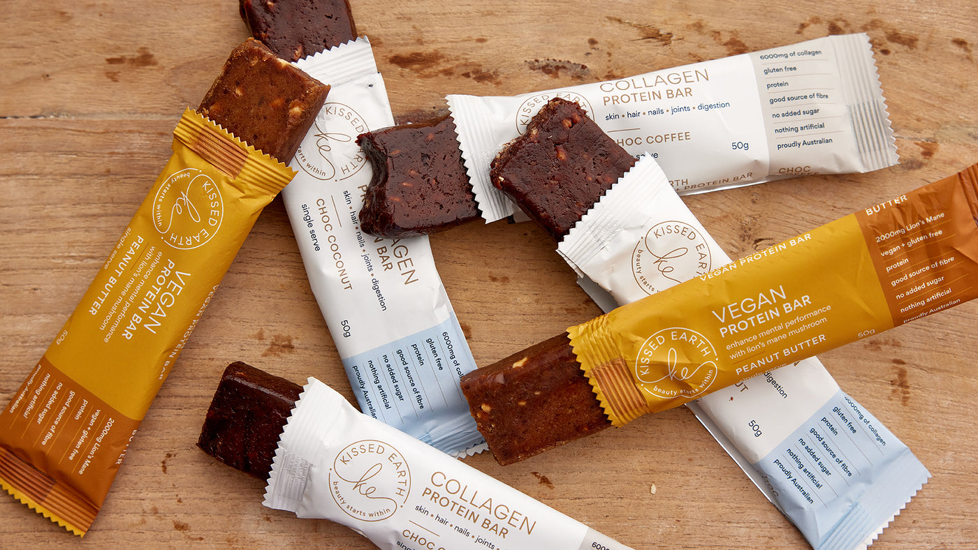 Kissed Earth Protein Bars come with an array of exciting benefits including providing your body with; high-quality protein for muscle support and recovery, collagen peptides which are incredible for skin, hair, nail and joint health, and a convenient source of nutrition for those on the go. On top of that our protein bars use natural ingredients without any nasty artificial ingredients. Oh, and one final thing — they are delicious.