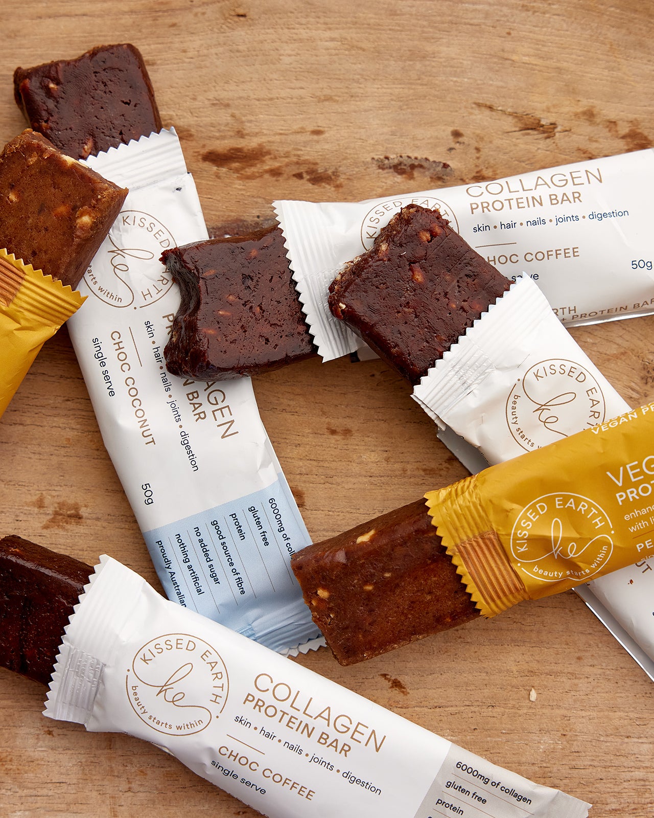 Kissed Earth Protein Bars contain high-quality protein sources, including our signature collagen peptides, along with natural flavours, fibres, and healthy fats. We avoid artificial additives and focus on clean, wholesome ingredients. You can read the entire ingredient list on each of our protein bar product pages.