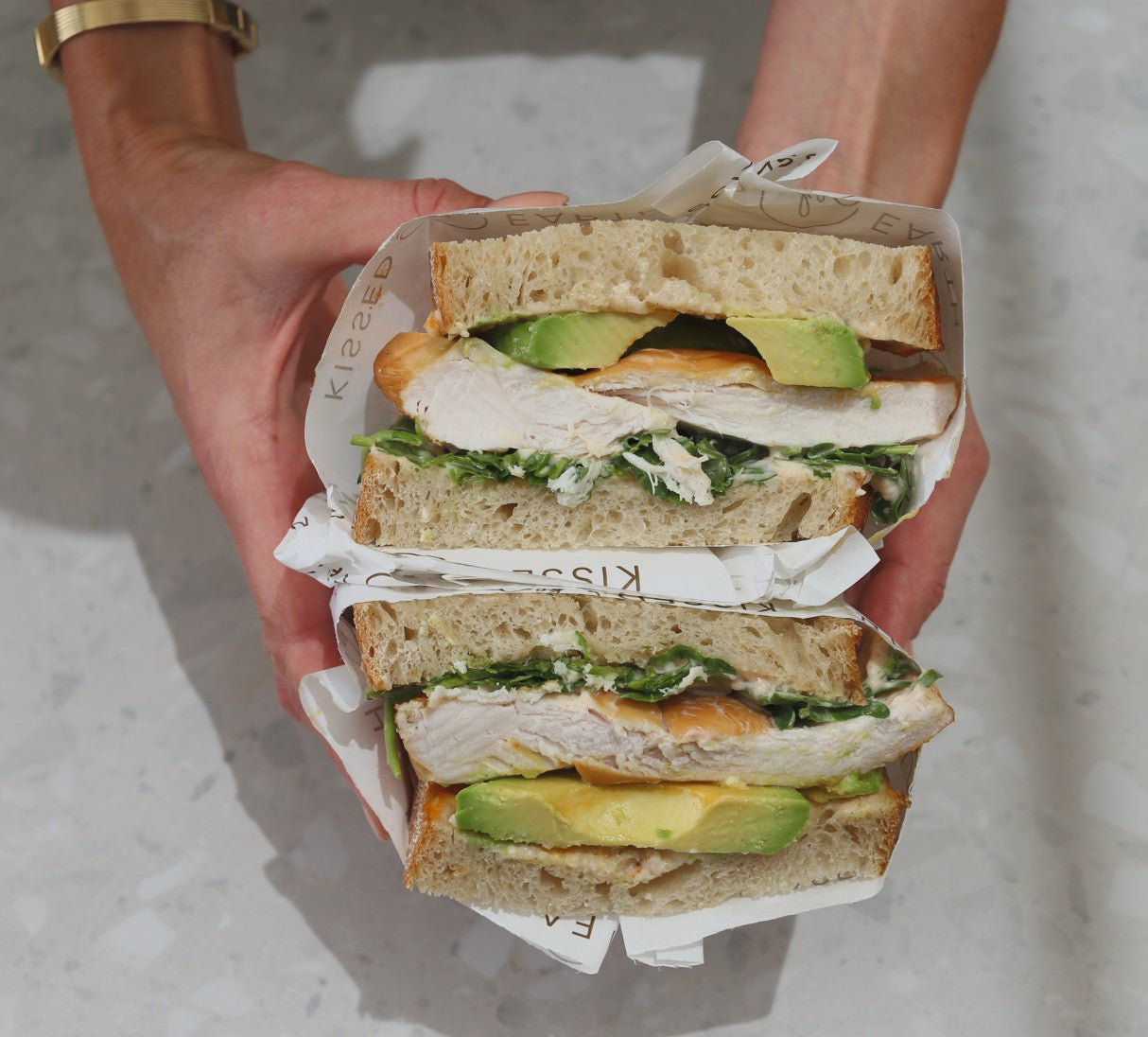 With our signature chili jam (nut free)Smoked chicken breast with creamy avocado, crisp rocket, smooth house aioli and a touch of our signature chilli jam.