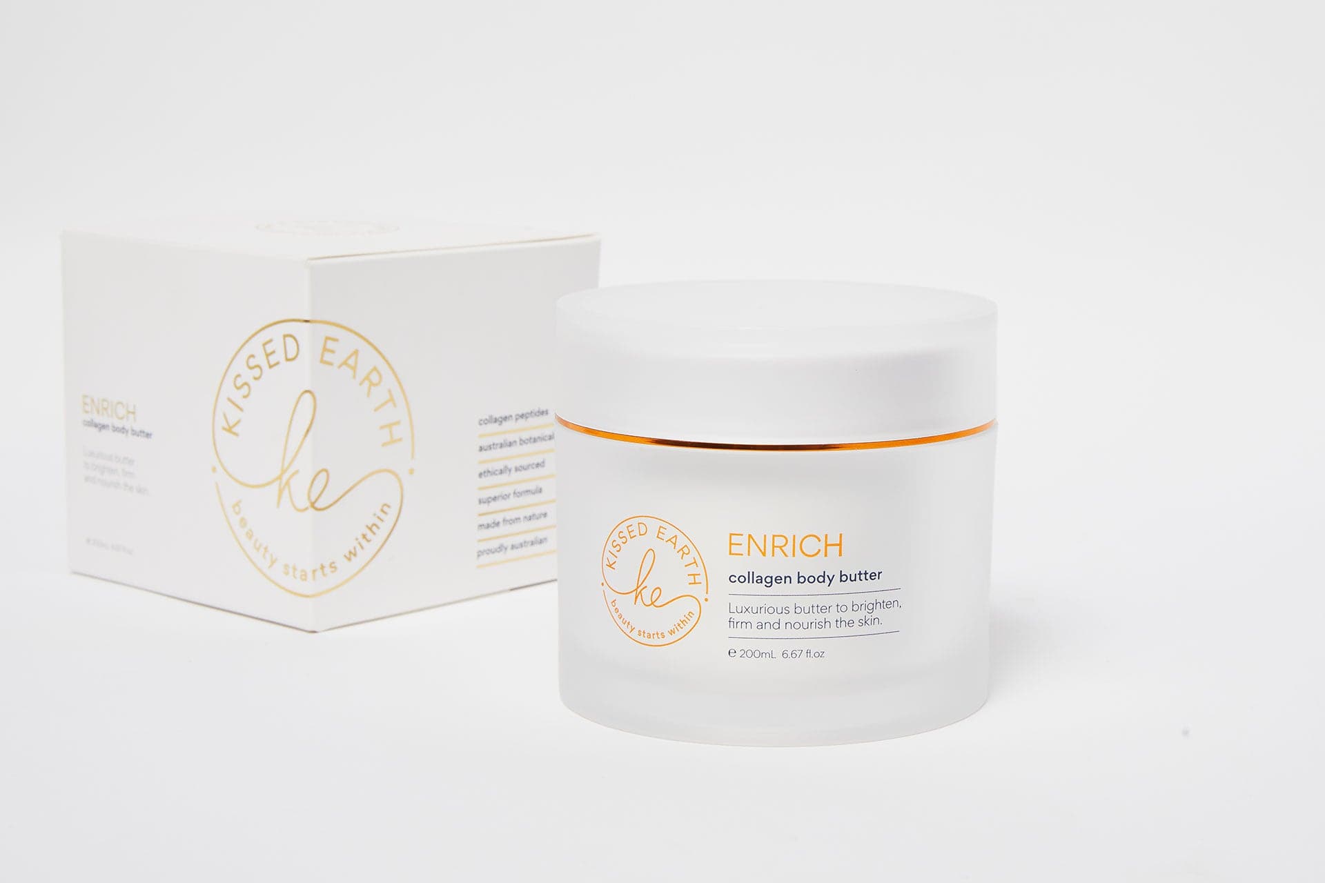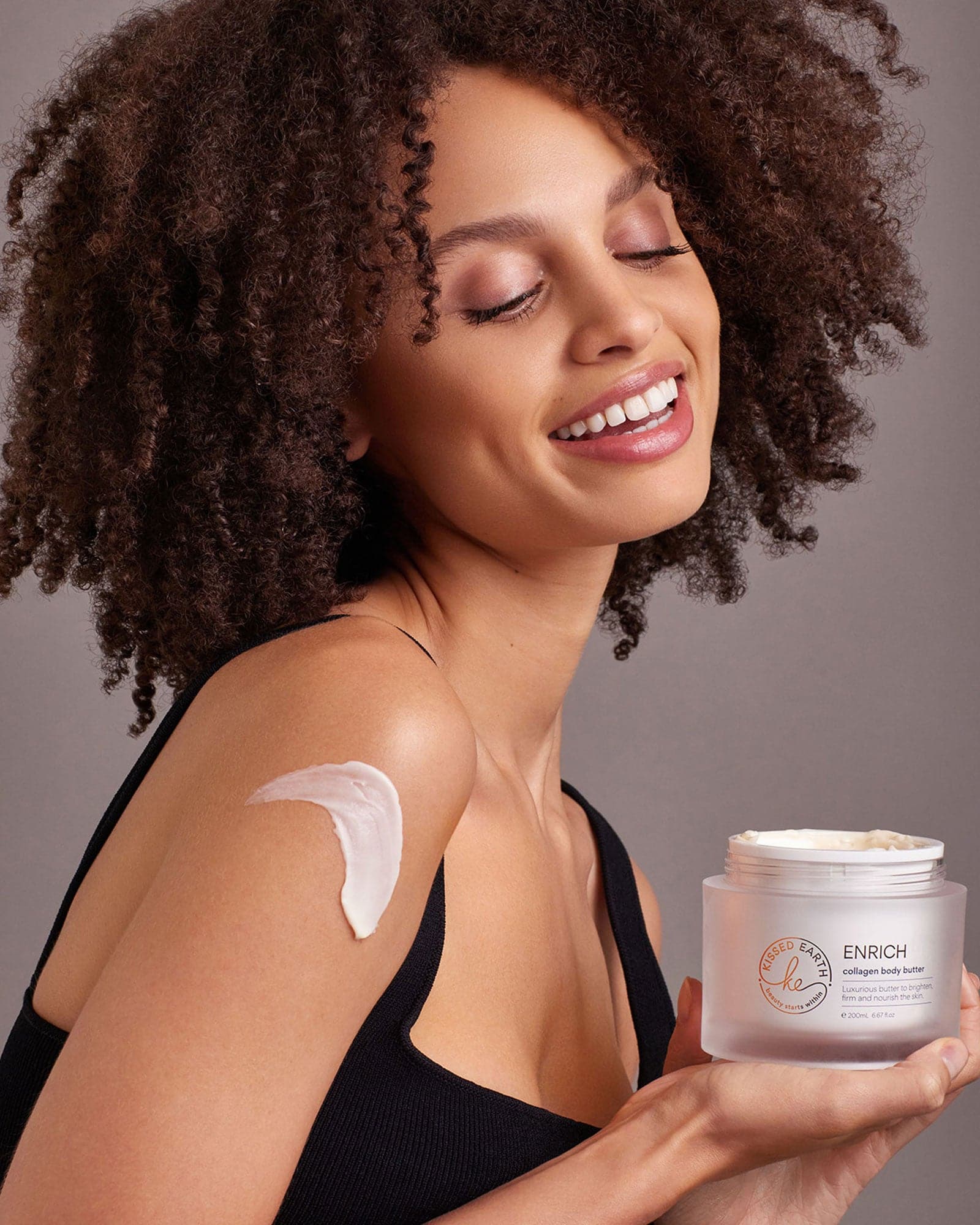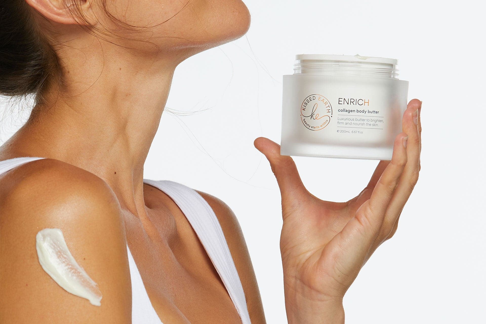 Enrich Collagen Body Butter provides instant nourishment and hydration to your skin from the moment it’s applied. You'll feel a luxurious surge of moisture, leaving your skin silky smooth and deeply moisturised. While the immediate hydration is noticeable, the full range of benefits from the collagen skin cream, including the softening of dry and dehydrated skin, strengthening of the skin's barrier, and smoothing of cracked heels and elbows, become increasingly apparent with regular use over time. For optimal results, we recommend using Enrich Collagen Body Butter consistently for at least 4 to 6 weeks to experience the transformative effects on your skin.