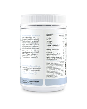 Salmon, Sweet Potato, Green Lipped Mussel powder, Glucosamine, MSM, Vitamins & Minerals (including Calcium, Phosphorus, Potassium, Sodium, Chloride, Magnesium, Iron, Copper, Zinc, Manganese, Iodine, Selenium, Vitamins A, D3, E, B1, B2, B3, B5, B6, B9 B12, Choline), Psyllium Husk, Flax Seed meal, Petagile Collagen, Vegetable oils (Sunflower and Flaxseed) stabilised with mixed tocopherols & Rosemary extract, Chicory Root extract, Sorbic Acid, Yucca Schidigera extract.