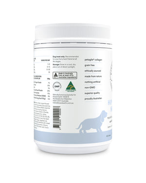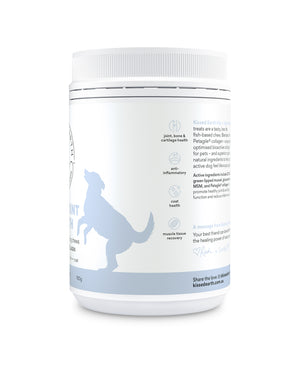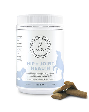 Kissed Earth Pets - Hip + Joint Health  A uniquely formulated daily supplement chew offering the best possible support for your dog's joints, bones and ligaments. Blended with protein and nutrient dense Salmon and Green Lipped Mussel, Petagile collagen – a specially optimized bioactive collagen for pets, and superior quality natural ingredients with an abundance of vitamins and minerals (including Calcium, Phosphorus, Potassium, Sodium, Chloride, Magnesium, Iron, Copper, Zinc, Manganese, Iodine, Selenium, Vitamins A, D3, E, B1, B2, B3, B5, B6, B9 B12, Choline) to help your active dog feel like a pup again.